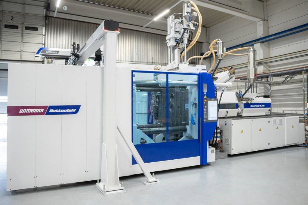 The machine most recently delivered is a 3-component model from the MacroPower series with 7,000 kN clamping force and enlarged clamping plates. This MacroPower XL 700/3400H/350S/210V was installed at Wirthwein Crimmitschau in February of this year. The machine is used to manufacture a component for a car window regulator consisting of PA, TPE and POM. The machine is equipped with a W843 pro robot from WITTMANN, which removes the finished parts and deposits them on a conveyor belt. Moreover, this machine comes with the HiQ Flow application software, which serves to detect and compensate viscosity fluctuations in the material. A special feature of the MacroPower XL 700 installed at Wirthwein is its direct control of the mold’s index plate by way of complete integration of the mold’s servo motor in the machine’s Unilog B8 control system. This enables high-precision rotary movements of the large-sized, heavy index plate and thus ensures an extremely safe production process.
