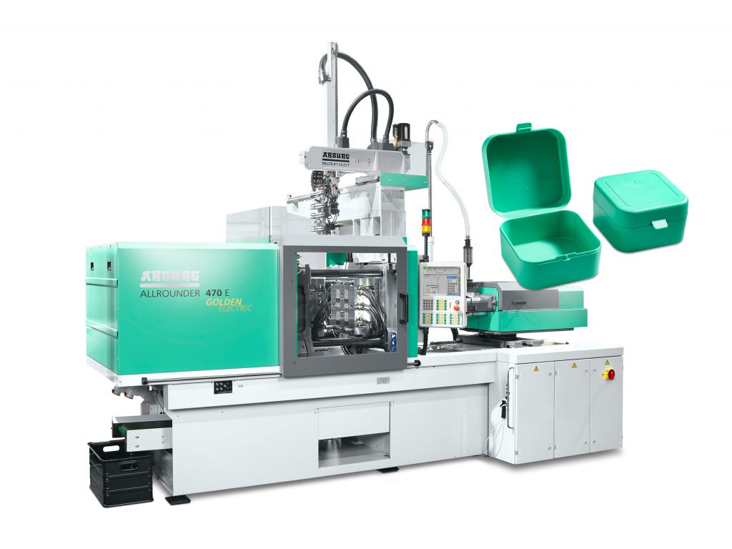 Arburg is using an electric Allrounder 470 E Golden Electric with a clamping force of 1,000 kN and a size 290 injection unit to demonstrate the cost-efficient, automated production of plastic parts at Plastimagen 2019. The exhibited machine will be using a 1-cavity mould from Langer Molds and Tools to produce 61-gram PP all-purpose boxes with snap locks in a cycle time of around 15 seconds. The injection moulding machine is compactly automated with a Multilift Select. The linear robotic system first removes the moulded part from the mould and forwards it to a laser station, where the logos of the application partners are added. The box is then closed on an assembly table and the now ready-to-use item is placed on a conveyor belt by the Multilift Select to be made available to trade fair visitors as a giveaway.