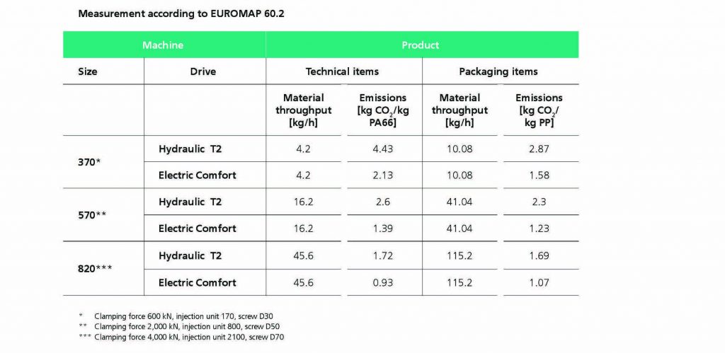 Fig. 7: By way of example, Arburg investigated the CO2 emissions of Allrounders in three sizes and two drive types using measurements in accordance with EUROMAP 60.2. One technical part and one packaging item each were manufactured