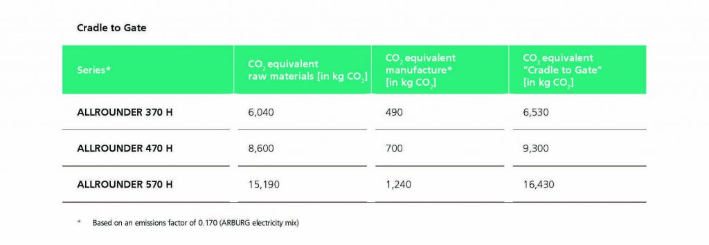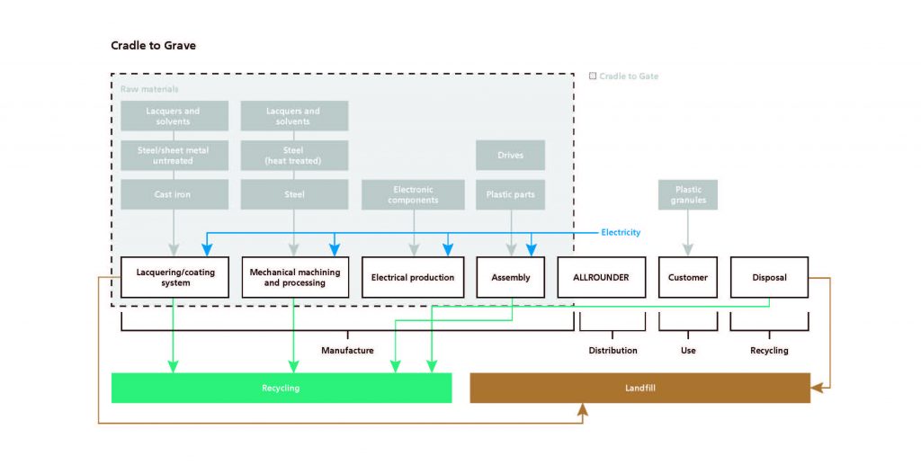 Fig. 1: In the “cradle to gate” analysis, Arburg accounts for the CO2 emissions of its Allrounder injection moulding machines from the raw materials used and the manufacturing process to delivery.
