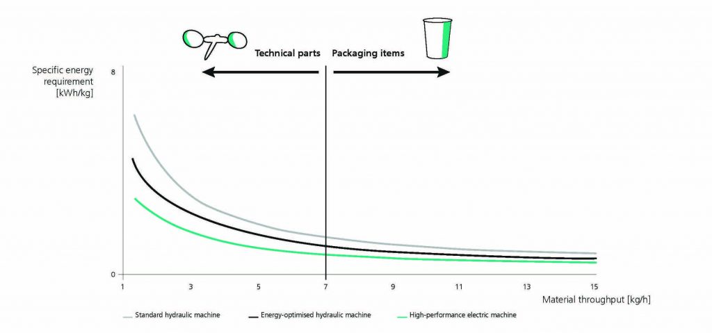 Fig. 6: The specific energy requirement of an injection moulding machine in the operating phase depends on the equipment, type of application, and material throughput. Generally speaking, the better the machine’s capacity utilisation, the more favourable its carbon footprint.