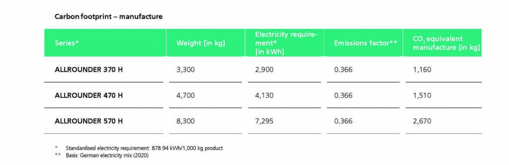 Fig. 3: Electricity-related CO2 emissions in the production of an injection moulding machine can be calculated on the basis of the German electricity mix (0.366 for the year 2020).