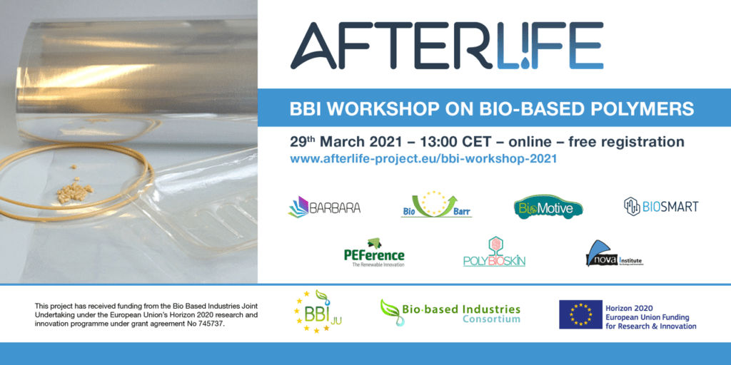 A lot is already possible: From the valorisation of wastewater over biodegradable, biocompatible wound dressings and automotive prototypes derived from organic waste to FDCA based on agricultural co-products and bio-smart packaging. The workshop will take place on 29 March 2021 from 13:00 to 16:40 CET. Registration and workshop programme can be found at www.afterlife-project.eu/bbi-workshop-2021.