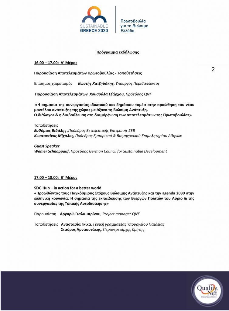 Διανέμουμε το Πρόγραμμα της διαδικτυακής εκδήλωσης, την οποία διοργανώνει το ίδρυμα QualityNet υπό την αιγίδα του ΥΠΕΝ, για την βιώσιμη ανάπτυξη και την επιχειρηματικότητα στην Ελλάδα.