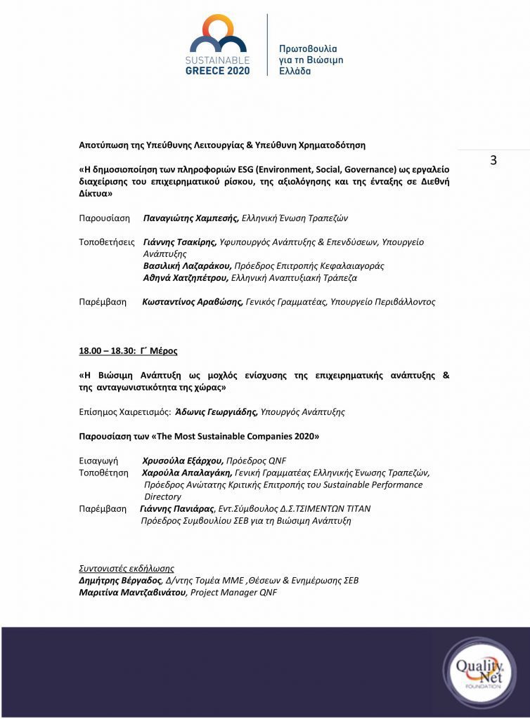 Η επετειακή εκδήλωση ολοκληρώνεται με την παρουσίαση των «The Most Sustainable Companies in Greece 2020», των επιχειρήσεων αυτών που, μετά από τεχνική αξιολόγηση, δημιουργούν τον Επιχειρηματικό Χάρτη της Βιώσιμης Ανάπτυξης στη χώρα μας.